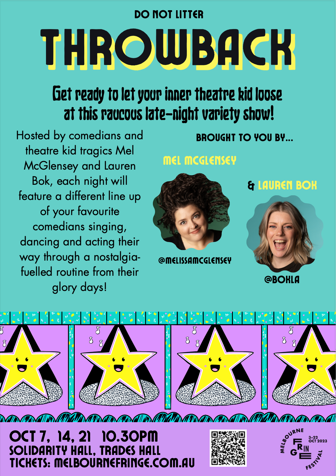 THROWBACK is a talent show that asks comedians to do an encore performance of their breakout role from childhood. Hosted by Mel McGlensey and Lauren Bok, each night will feature a different line up of your favourite comedians singing, dancing and acting their way through a nostalgia-filled routine from their glory days. Strap on your tap shoes, dust off that wig and get ready to let your inner theatre kid loose at this raucous late-night variety show!